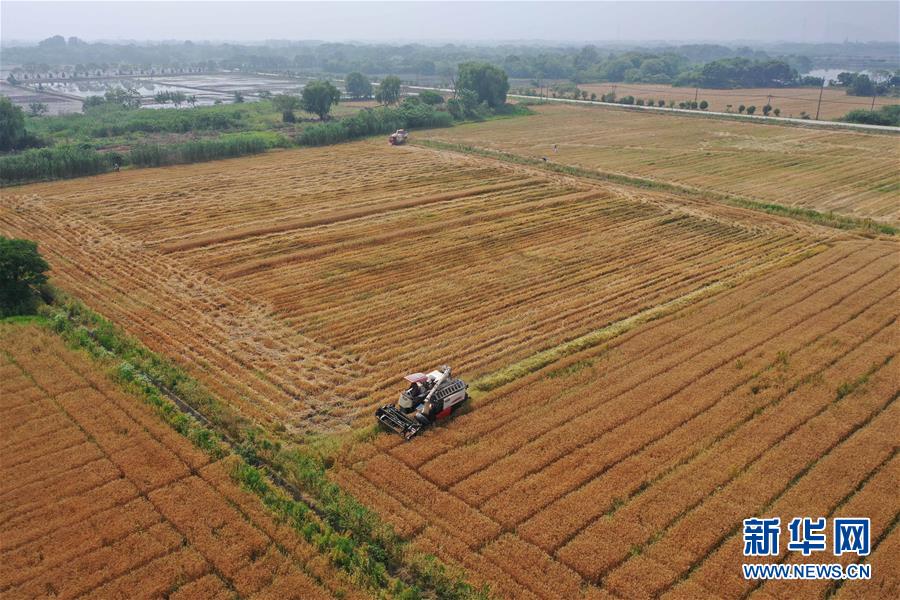 5月24日,農(nóng)戶駕駛收割機在浙江省湖州市吳興區(qū)八里店鎮(zhèn)尹家圩糧油植保農(nóng)機專業(yè)合作社的麥田里進行收割作業(yè)(無人機照片)。新華社記者黃宗治攝