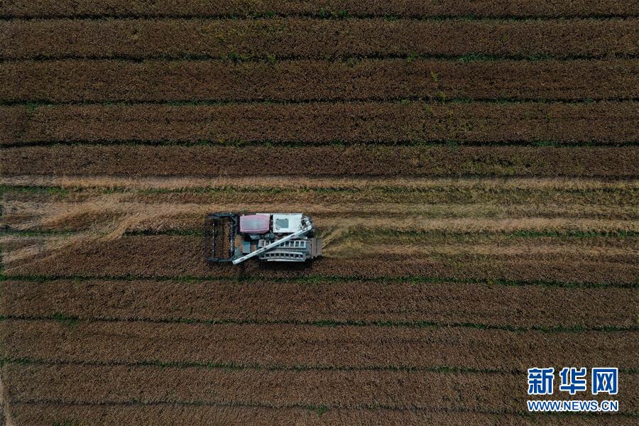 5月24日,農(nóng)戶駕駛收割機在浙江省湖州市吳興區(qū)八里店鎮(zhèn)尹家圩糧油植保農(nóng)機專業(yè)合作社的麥田里進行收割作業(yè)(無人機照片)。新華社記者黃宗治攝