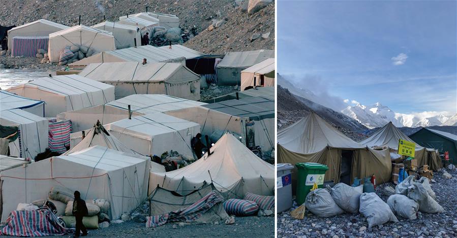 拼版照片:左圖為2005年的春季登山季,為測(cè)量、登山和科考等隊(duì)伍提供服務(wù)保障的當(dāng)?shù)厝罕娫谥榉宕蟊緺I(yíng)搭起的帳篷(資料照片)。新華社記者索朗羅布攝右圖為2020珠峰高程測(cè)量活動(dòng)中,曾經(jīng)被視為登山隊(duì)最好的帳篷變成了垃圾集中存放處。新華社記者普布扎西攝
