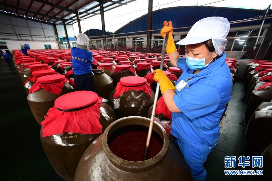 5月26日,工人在貴州省黔東南苗族侗族自治州麻江縣明洋食品公司生產(chǎn)車間攪拌釀造過(guò)程中的酸湯原料。