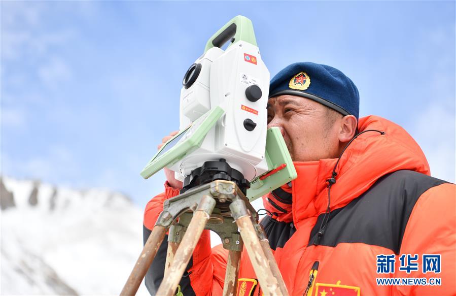 自然資源部第一大地測(cè)量隊(duì)隊(duì)員鄭林在使用全站儀對(duì)珠峰峰頂進(jìn)行交會(huì)觀測(cè)(5月27日攝)。新華社記者晉美多吉攝