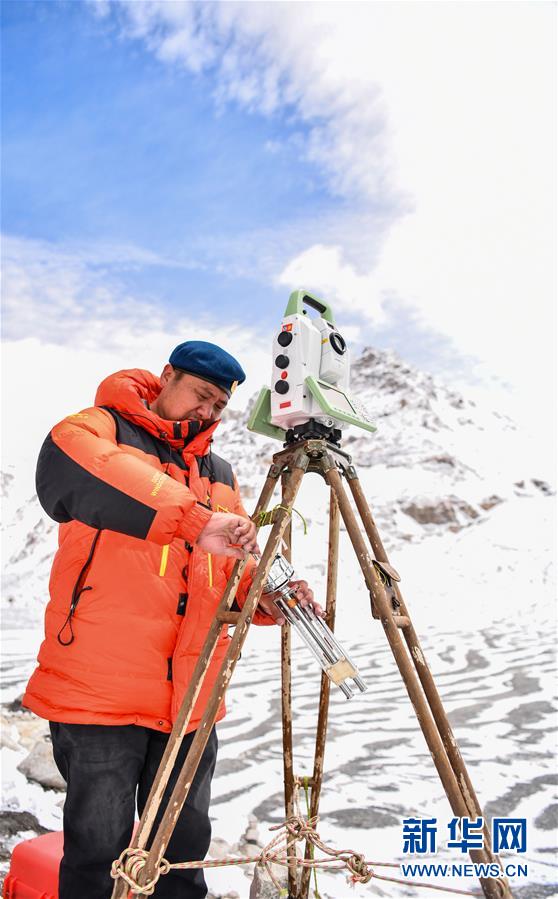 自然資源部第一大地測量隊(duì)隊(duì)員鄭林在使用全站儀對(duì)珠峰峰頂進(jìn)行交會(huì)觀測(5月27日攝)。新華社記者孫非攝