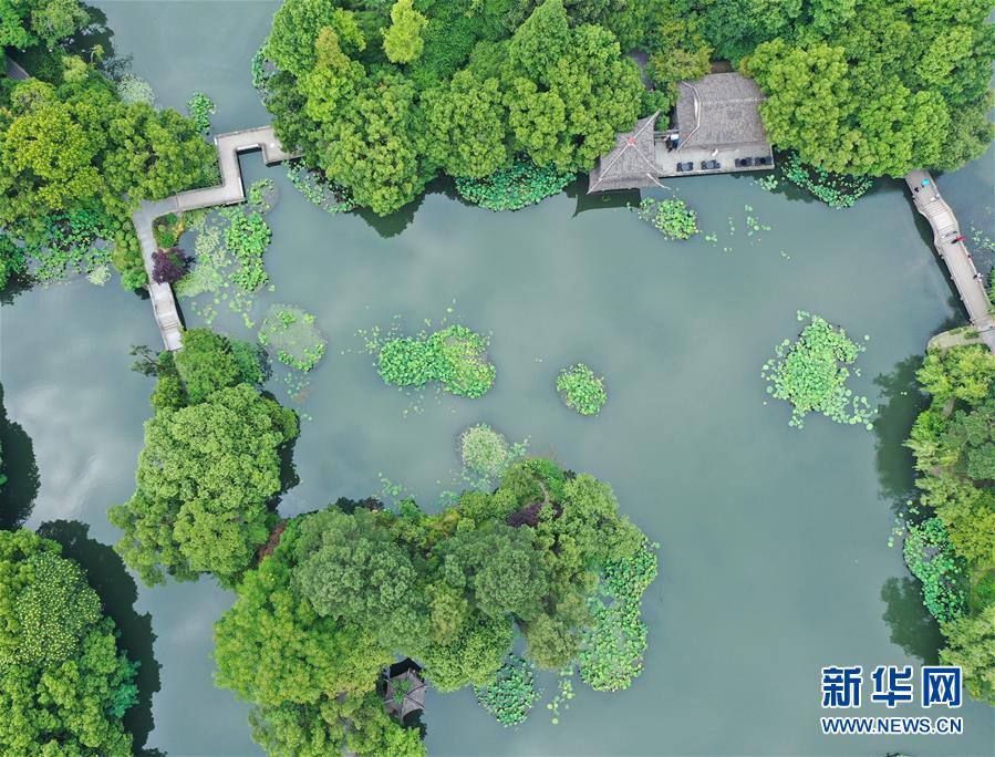 5月27日,游人在西湖曲院風(fēng)荷景區(qū)游覽(無人機照片)。隨著氣溫升高,杭州西湖綠意蔥蘢,展現(xiàn)出柔美的湖光山色。新華社記者翁忻旸攝