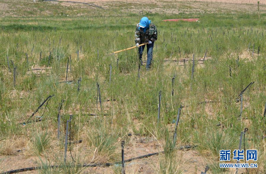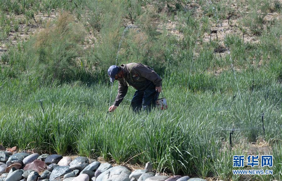 5月28日,工人在巴丹吉林鎮(zhèn)生態(tài)修復(fù)項(xiàng)目南部河道附近修理噴灌設(shè)備,以節(jié)約用水。2017年以來(lái),內(nèi)蒙古阿拉善右旗在巴丹吉林鎮(zhèn)開展生態(tài)修復(fù)項(xiàng)目,種植適合在當(dāng)?shù)厣L(zhǎng)的馬蓮、紅柳等植物,修復(fù)生態(tài)的同時(shí)也起到美化作用。巴丹吉林鎮(zhèn)是巴丹吉林沙漠旅游景區(qū)的游客集散地,這里常年干旱少雨,水資源匱乏。新華社記者徐欽攝