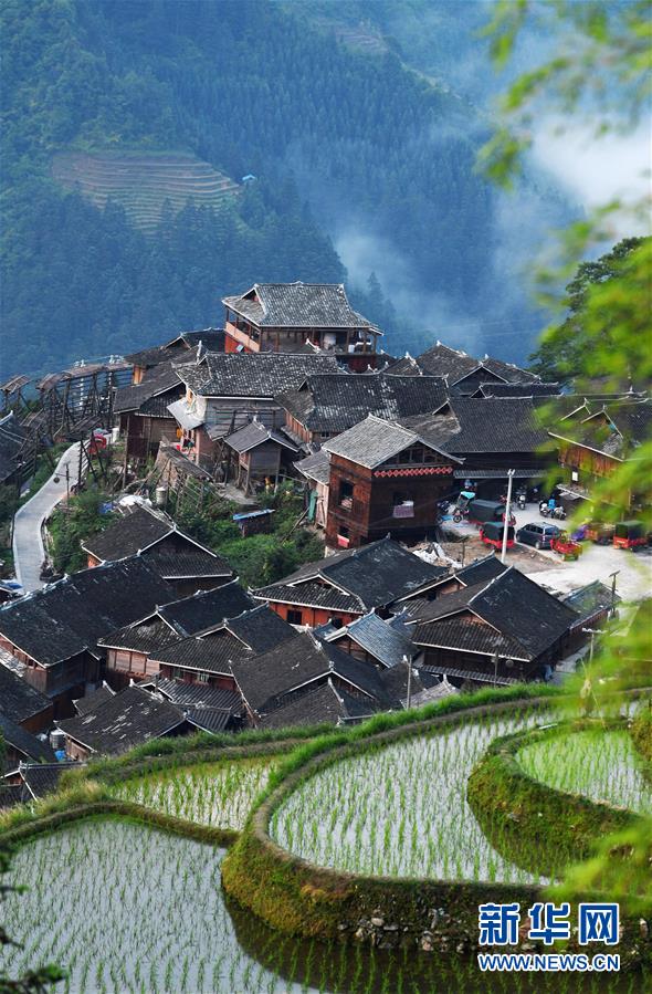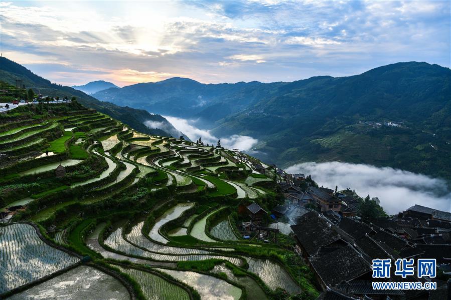 這是從江縣加榜鄉(xiāng)加車苗寨和梯田(5月28日攝)。夏日時節(jié),位于貴州省黔東南苗族侗族自治州從江縣加榜鄉(xiāng)加車、加頁、黨扭等苗寨的梯田在晨霧與陽光的映襯下線條分明,光影變幻,景色如畫。新華社記者 楊文斌 攝