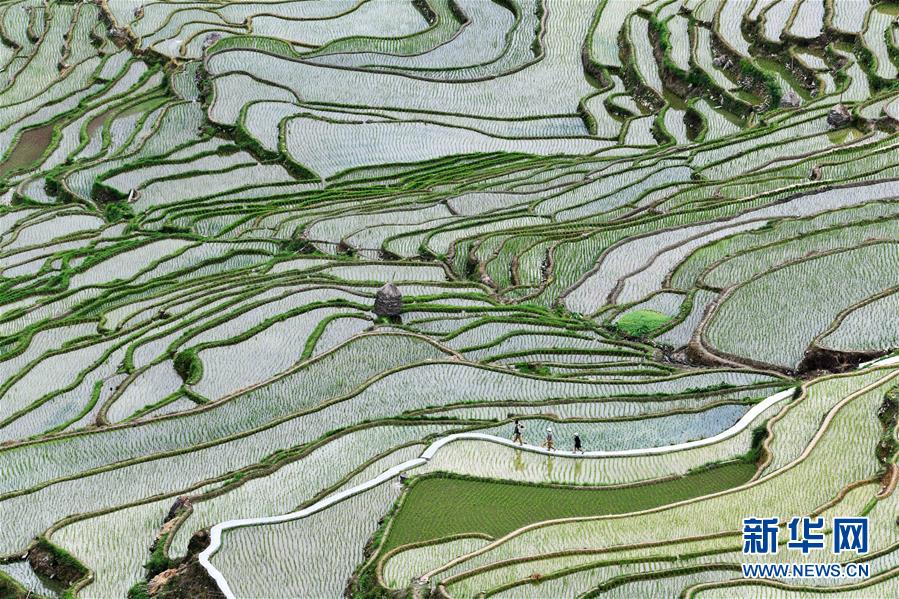 村民從從江縣加榜鄉(xiāng)黨扭梯田上經(jīng)過(5月26日攝)。夏日時節(jié),位于貴州省黔東南苗族侗族自治州從江縣加榜鄉(xiāng)加車、加頁、黨扭等苗寨的梯田在晨霧與陽光的映襯下線條分明,光影變幻,景色如畫。新華社記者 楊文斌 攝