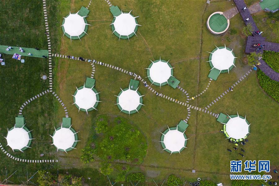 5月31日,空中俯瞰石淙花海內(nèi)的帳篷露營區(qū)(無人機照片)。新華社記者徐昱攝