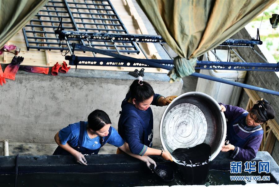 2018年,楊成蘭在村里成立傳統(tǒng)織染合作社,吸引村里及周邊村寨貧困戶入股,帶動當(dāng)?shù)刎毨艉痛迕窦尤牒献魃?,從事織布、染布、藍(lán)靛種植等產(chǎn)業(yè),在傳承民族傳統(tǒng)手工技藝的同時,幫助村民脫貧增收。新華社記者楊文斌攝