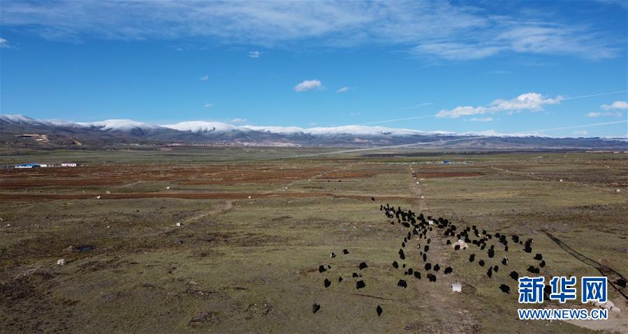 這是5月29日在四川省甘孜藏族自治州理塘縣奔戈鄉(xiāng)卡灰村拍攝的集體農(nóng)場(無人機(jī)照片)。四川省甘孜藏族自治州理塘縣地處青藏高原東部,縣城海拔約4000米,有“天空之城”的美譽(yù)。時值初夏,理塘的天空碧藍(lán)如洗,巍峨的雪山環(huán)繞四周,牦牛星星點點散落于曠野之上,構(gòu)成一幅高原特有的壯美圖景。新華社記者李夢馨攝