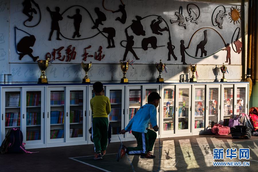 鐘煒鋒在校園小廣場上和同學(xué)練跳繩,當(dāng)天晚上,電影《點點星光》將在七星小學(xué)操場上舉行首映式(2019年11月15日攝)。新華社記者劉大偉攝