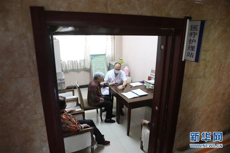 6月1日,在正定縣塔元莊村勁松老年公寓,醫(yī)護(hù)人員在醫(yī)療護(hù)理站為老人測(cè)量血壓。新華社記者朱旭東攝。