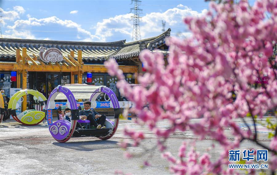 在延邊朝鮮族自治州和龍市“金達(dá)萊”民俗村,村民在村內(nèi)的咖啡館前體驗(yàn)親子游樂(lè)項(xiàng)目(5月6日攝)。新華社記者許暢攝。