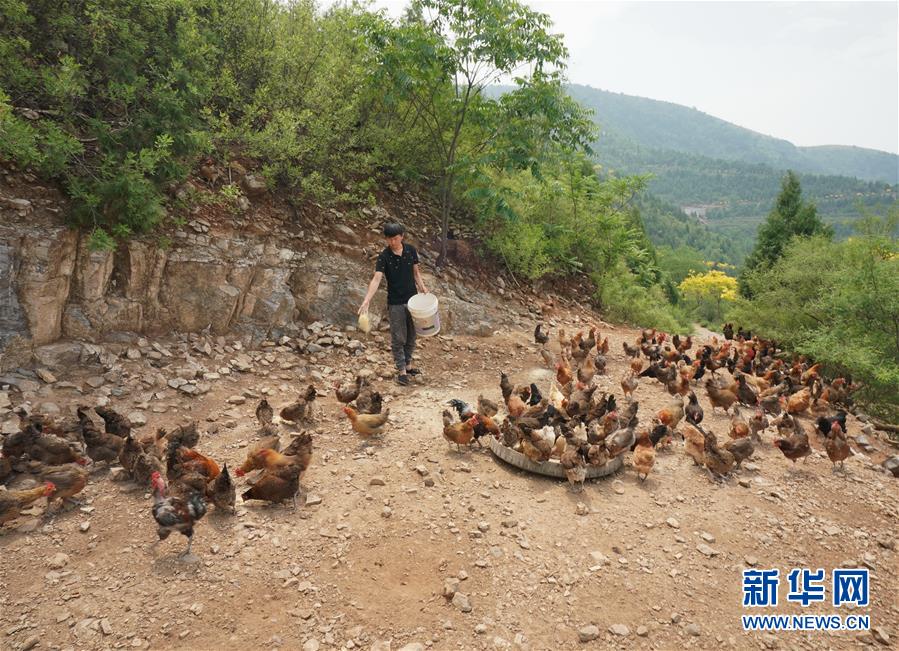 6月4日,唐山市豐潤(rùn)區(qū)火石營(yíng)鎮(zhèn)趙莊子村百草坡農(nóng)產(chǎn)品農(nóng)民專業(yè)合作社社員在生態(tài)農(nóng)業(yè)園給散養(yǎng)雞喂食。新華社記者郭雅茹攝。