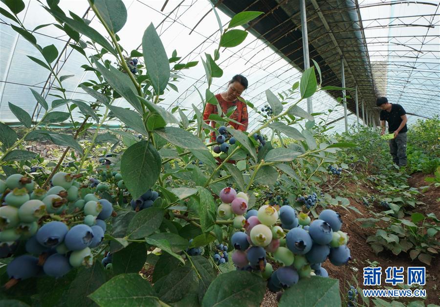 6月4日,唐山市豐潤(rùn)區(qū)火石營(yíng)鎮(zhèn)趙莊子村百草坡農(nóng)產(chǎn)品農(nóng)民專業(yè)合作社社員在生態(tài)農(nóng)業(yè)園的大棚內(nèi)采摘藍(lán)莓。新華社記者郭雅茹攝。