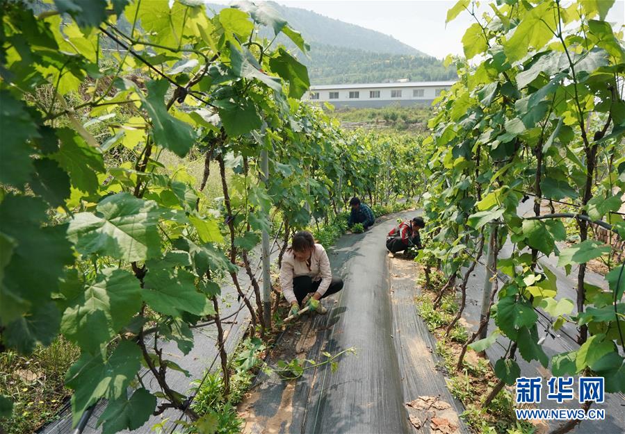 6月4日,唐山市豐潤(rùn)區(qū)火石營(yíng)鎮(zhèn)趙莊子村百草坡農(nóng)產(chǎn)品農(nóng)民專業(yè)合作社社員在生態(tài)農(nóng)業(yè)園給葡萄藤除草。新華社記者郭雅茹攝。