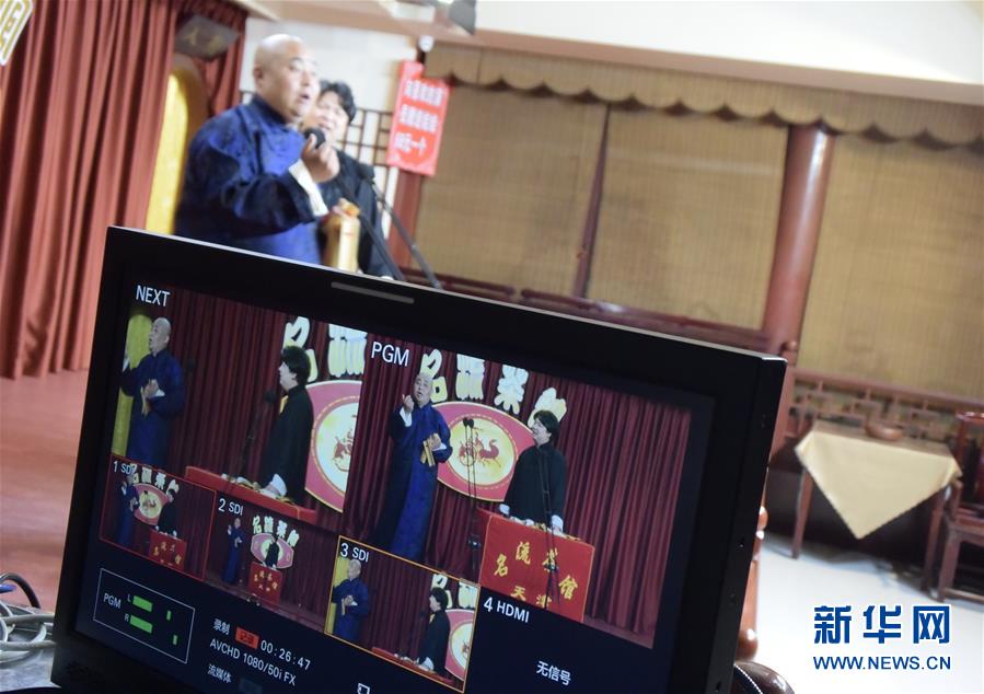 6月6日晚,天津名流茶館的相聲演員在付費(fèi)直播《名流名家“逗你玩”》演出中說(shuō)相聲。隨著疫情防控形勢(shì)逐漸向好,天津的一些茶館紛紛轉(zhuǎn)戰(zhàn)“云端”說(shuō)相聲,推出付費(fèi)直播演出,并邀請(qǐng)一些幸運(yùn)觀眾到現(xiàn)場(chǎng)觀看,在傳播津味相聲、培養(yǎng)年輕觀眾的同時(shí),也為即將到來(lái)的線下演出“預(yù)熱”。新華社記者周潤(rùn)健攝