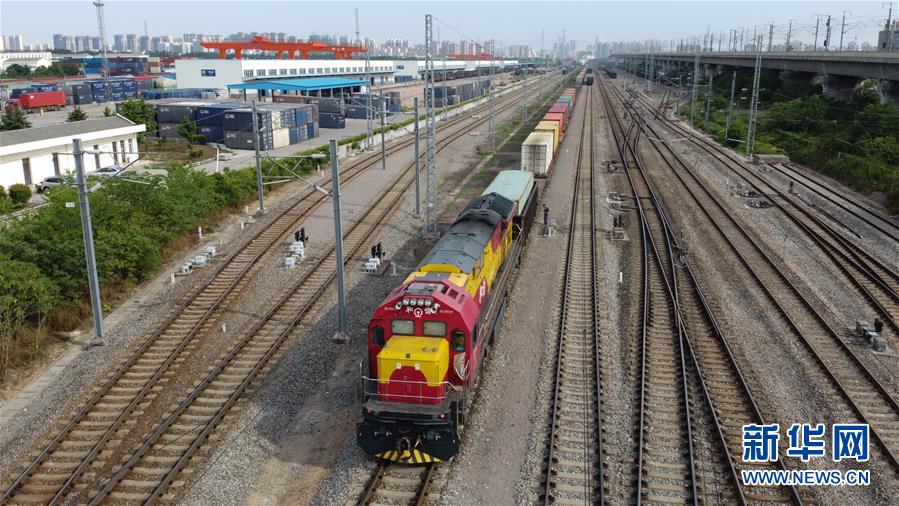 6月6日,合肥首開至荷蘭蒂爾堡的中歐班列準(zhǔn)備從合肥北站物流基地駛出(無人機(jī)照片)。當(dāng)日,搭載82個標(biāo)準(zhǔn)集裝箱的中歐班列從中國鐵路上海局集團(tuán)有限公司合肥貨運中心合肥北站物流基地駛出發(fā)往荷蘭蒂爾堡,標(biāo)志著合肥中歐班列通往荷蘭蒂爾堡的線路正式開通。新華社記者張端攝