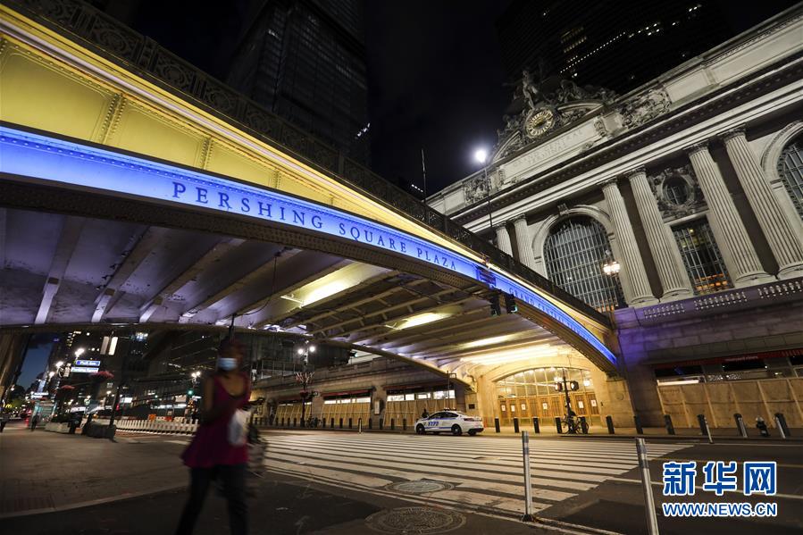 6月7日,美國(guó)紐約中央車(chē)站天橋點(diǎn)亮藍(lán)色和金色燈光。新華社記者王迎攝
