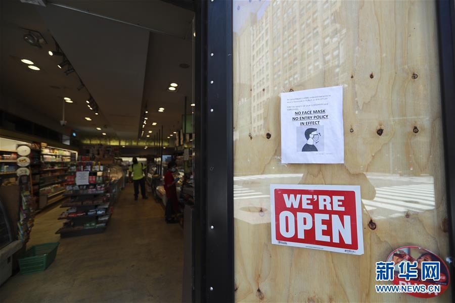 6月8日,美國紐約一家商店的門口貼著佩戴口罩方可進(jìn)入的提示。在因新冠疫情進(jìn)入“居家令”近三個(gè)月之后,美國紐約市于當(dāng)?shù)貢r(shí)間8日開始“解封”,進(jìn)入經(jīng)濟(jì)重啟的第一階段。新華社記者王迎攝