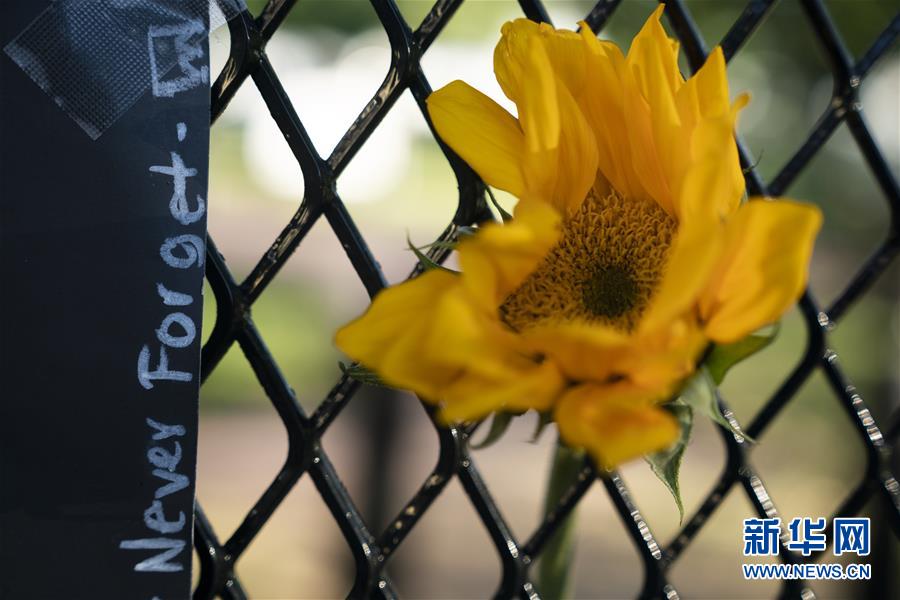 6月8日,美國華盛頓白宮附近的隔離圍欄上貼著“永不忘卻”的抗議標語。新華社記者劉杰攝
