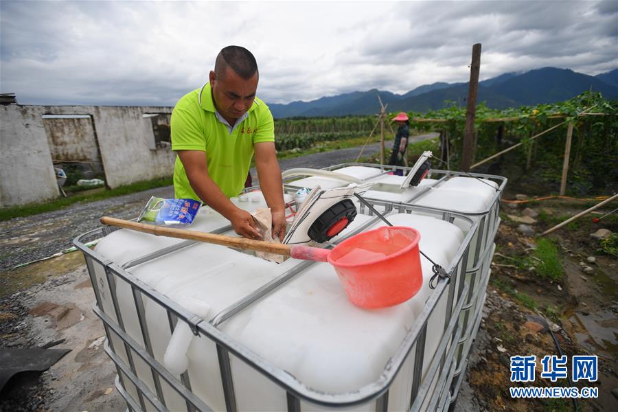 6月9日,在江華瑤族自治縣濤圩鎮(zhèn)鳳尾村蔬菜基地,農(nóng)戶在配制農(nóng)作物消毒水。近日,受連續(xù)強(qiáng)降雨影響,湖南省永州市江華瑤族自治縣遭遇洪澇災(zāi)害,部分農(nóng)田受災(zāi)。目前,江華瑤族自治縣洪水已退,群眾在當(dāng)?shù)叵嚓P(guān)部門引導(dǎo)下積極開展生產(chǎn)自救。新華社記者陳澤國(guó)攝