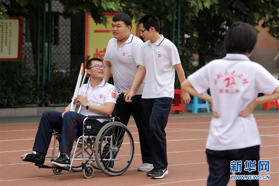 6月9日,河北省衡水市第二中學(xué)的高三學(xué)生推著一名腳部受傷的同學(xué)在操場(chǎng)上聊天散步。2020年高考臨近,河北省衡水市第二中學(xué)組織開展多種形式的集體“減壓”活動(dòng),幫助高三學(xué)生在緊張備考之余釋放身心壓力,以輕松、樂觀、自信的心態(tài)迎接高考。新華社記者朱旭東攝