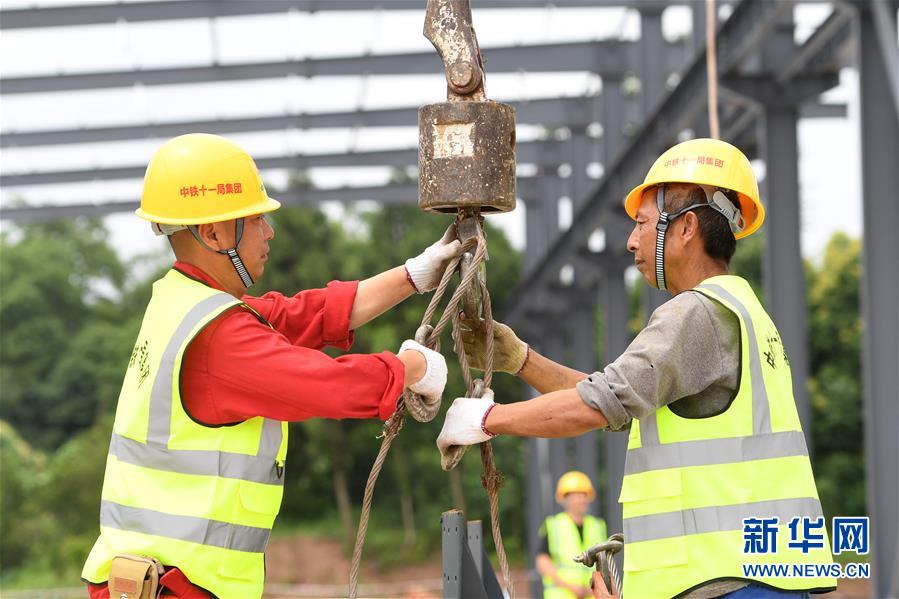 6月9日,工人在位于重慶市巴南區(qū)的渝湘高鐵重慶段建設(shè)工地現(xiàn)場作業(yè)。新華社記者唐奕攝