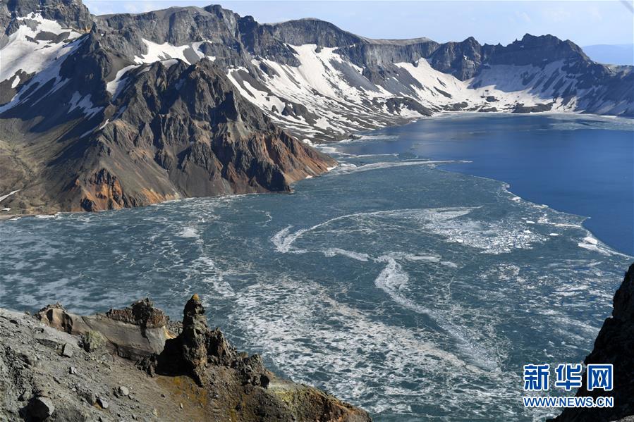 這是6月12日拍攝的長(zhǎng)白山天池。近日,長(zhǎng)白山天池冰層逐漸消融,迎來“開冰季”。新華社記者 林宏 攝