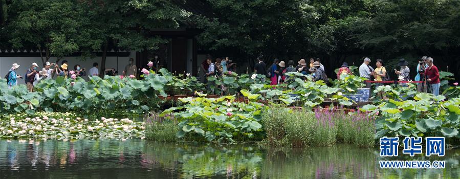 6月12日,游人在西湖郭莊觀看荷展。隨著氣溫升高,杭州西湖荷花次第開放,引得游人駐足。新華社記者 翁忻旸 攝