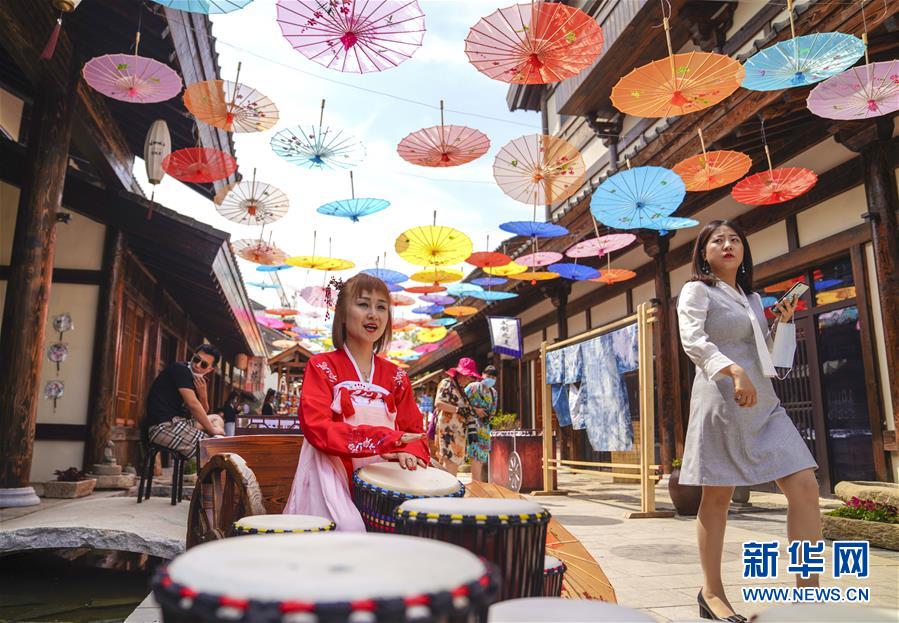 6月13日,在長春市世茂蓮花山小鎮(zhèn)寬厚里商街,一名古裝愛好者演奏手鼓。當日是“文化和自然遺產(chǎn)日”。吉林長春首屆蓮花山消夏生活節(jié)在世茂蓮花山小鎮(zhèn)舉行?;顒訉⒎沁z展示與假日消暑休閑相結合,讓游人在“古色古香”的油紙傘巷中品傳統(tǒng)文化魅力,享夏日休閑愜意。新華社記者許暢攝。