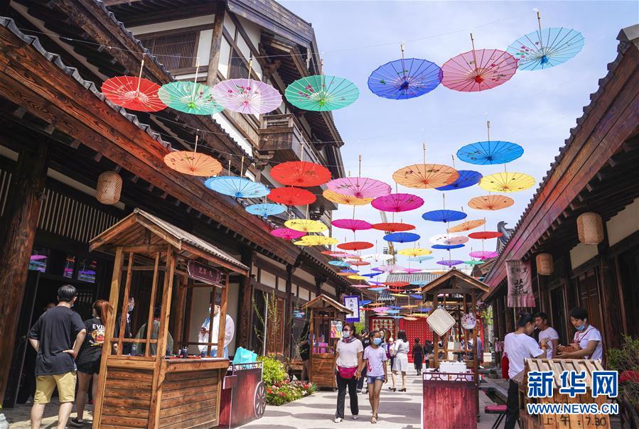 6月13日,市民在長(zhǎng)春市世茂蓮花山小鎮(zhèn)寬厚里商街參觀游覽。當(dāng)日是“文化和自然遺產(chǎn)日”。吉林長(zhǎng)春首屆蓮花山消夏生活節(jié)在世茂蓮花山小鎮(zhèn)舉行?;顒?dòng)將非遺展示與假日消暑休閑相結(jié)合,讓游人在“古色古香”的油紙傘巷中品傳統(tǒng)文化魅力,享夏日休閑愜意。新華社記者 許暢 攝