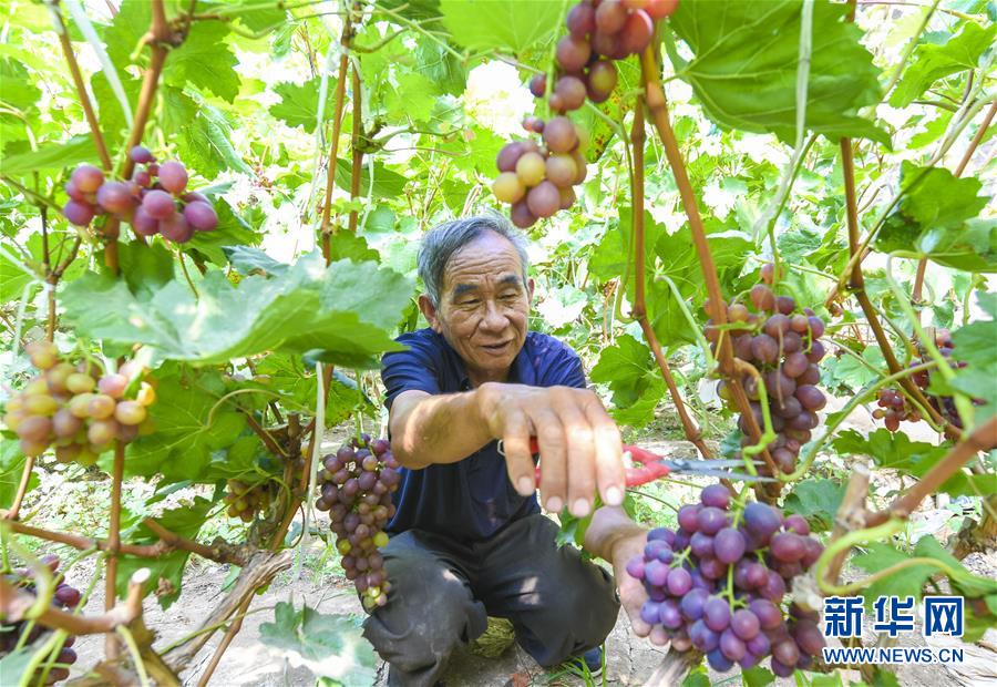 6月14日,河北省永清縣龍虎莊鄉(xiāng)劉莊村果農(nóng)在大棚內(nèi)采摘葡萄。新華社記者 李曉果 攝