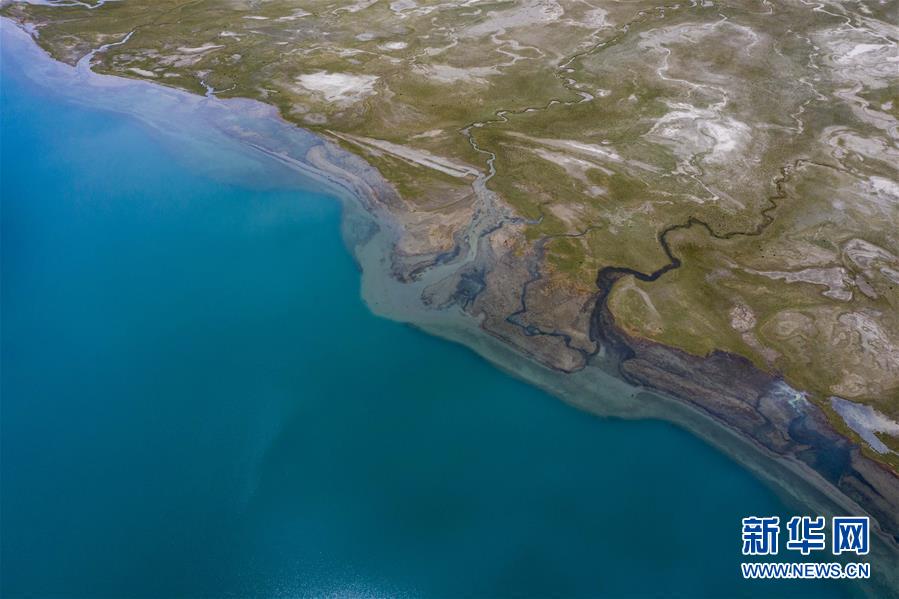 帕米爾高原上的喀拉庫勒湖及湖畔濕地一景(6月16日攝,無人機(jī)照片)。新華社記者 胡虎虎 攝