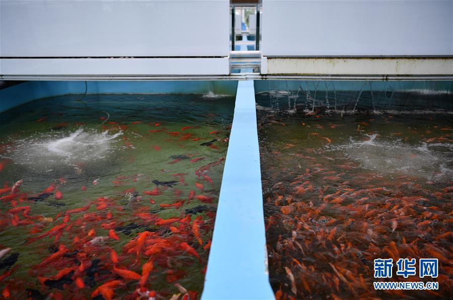 在天津現(xiàn)代晨輝科技集團有限公司的養(yǎng)殖示范場,工人在投喂飼料(6月15日攝)。近年來,天津市寶坻區(qū)大白莊鎮(zhèn)大力發(fā)展觀賞魚養(yǎng)殖,在當?shù)佚堫^企業(yè)的帶動下,成為增加農(nóng)民收入的新途徑。據(jù)了解,企業(yè)對附近養(yǎng)殖戶統(tǒng)一提供苗種、飼料、技術(shù)支持,以及觀賞魚成魚后保價回收的服務。養(yǎng)殖戶每畝水面平均收入約1.8萬元,解決周邊農(nóng)民就業(yè)近200人。新華社記者 李然 攝
