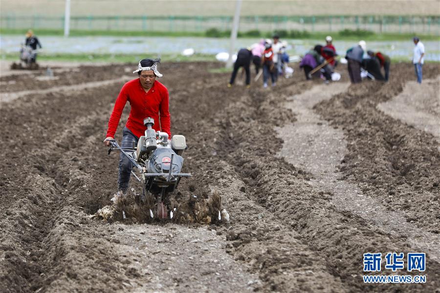 在四川省阿壩藏族羌族自治州壤塘縣尕多鄉(xiāng)瑟谷村熱不卡小組,村民尚壤扶著微耕機在蔬菜基地里耕地(6月13日攝)。新華社記者 沈伯韓 攝