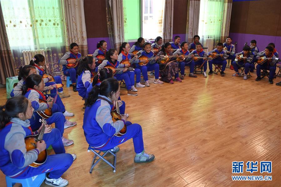 6月14日,孩子們在阿壩縣民族寄宿制小學內(nèi)的少年宮里用曼陀鈴進行彈唱。新華社記者 劉坤 攝