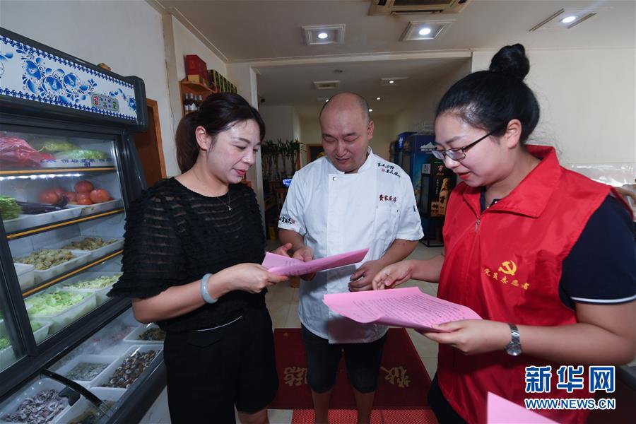 6月17日,黨員志愿者(右)在東林鎮(zhèn)一家農(nóng)家樂內(nèi)給經(jīng)營(yíng)戶發(fā)放野生動(dòng)物保護(hù)及禁食倡議書。新華社記者 徐昱 攝