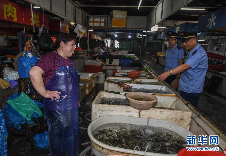 6月17日,市場(chǎng)監(jiān)管執(zhí)法人員在東林鎮(zhèn)農(nóng)貿(mào)市場(chǎng)開展專項(xiàng)執(zhí)法行動(dòng),檢查是否存在非法銷售野生動(dòng)物的情況。新華社記者 徐昱 攝