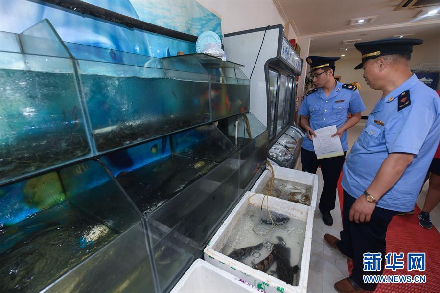 6月17日,市場(chǎng)監(jiān)管執(zhí)法人員在東林鎮(zhèn)一家農(nóng)家樂(lè)內(nèi)開(kāi)展專(zhuān)項(xiàng)執(zhí)法行動(dòng),檢查是否存在非法經(jīng)營(yíng)和加工野生動(dòng)物的情況。新華社記者 徐昱 攝