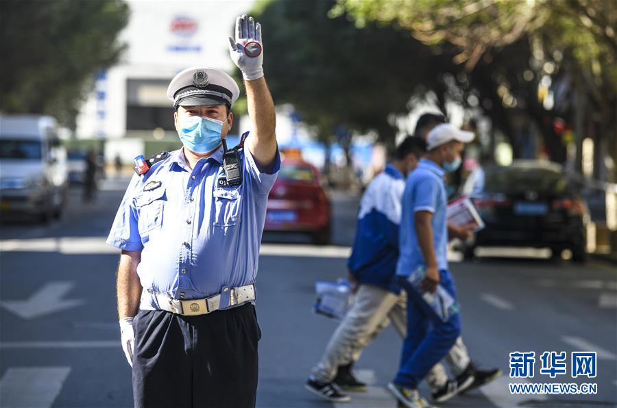 6月20日,在烏魯木齊市第二中學(xué)門前,烏魯木齊市公安局交警支隊天山區(qū)大隊新華路中隊警官艾力夏提·哈力木然提在指揮交通。當日,烏魯木齊市初中升高中考試開始。為保障為期三天的中考順利進行,烏魯木齊市公安局交警支隊在各考點執(zhí)勤,為考生保駕護航新華社記者 王菲 攝