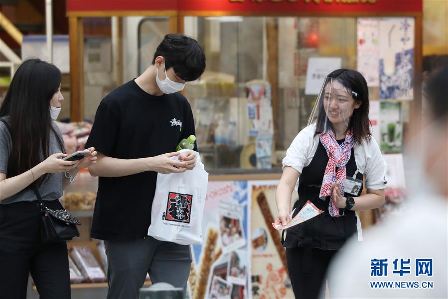 6月21日,在日本東京,一名人力車工作人員(右)向游客發(fā)傳單。當(dāng)日是周末,日本政府繼解除全國(guó)各地緊急狀態(tài)之后,19日起解除避免跨縣移動(dòng)的要求,全國(guó)范圍內(nèi)允許自由移動(dòng),進(jìn)一步松綁社會(huì)經(jīng)濟(jì)活動(dòng)。東京一些觀光景區(qū)內(nèi)的店鋪逐漸恢復(fù)營(yíng)業(yè),人流量有所回升。新華社記者杜瀟逸攝