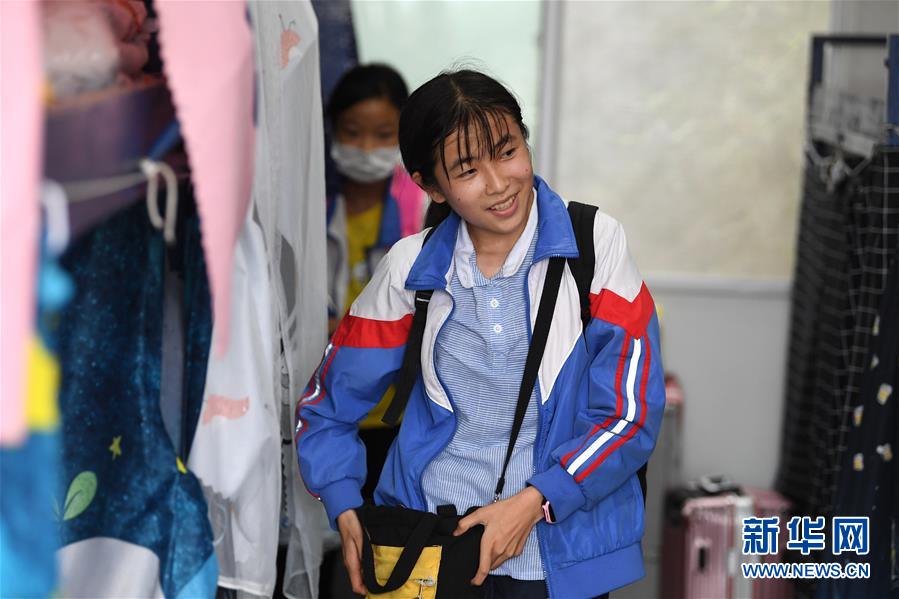 6月19日,在金寨縣三合實(shí)驗(yàn)學(xué)校宿舍,蔡齊艷放學(xué)后收拾行李準(zhǔn)備回家過(guò)周末。新華社記者劉軍喜攝