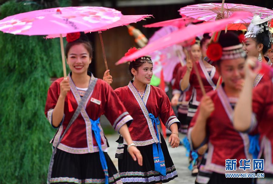 在廣西融水雙龍溝森林旅游度假區(qū)夢嗚苗寨,搬遷過來的苗族姑娘準(zhǔn)備給游客表演民族舞蹈(6月21日攝)。近年來,融水打造原生態(tài)苗族文化體驗園——夢嗚苗寨,讓搬遷進城的貧困戶住進復(fù)原建設(shè)的老房子。景區(qū)提供綠化保潔、游樂設(shè)施管理、民族歌舞表演等工作崗位,多渠道增加貧困戶收入。新華社記者黃孝邦攝