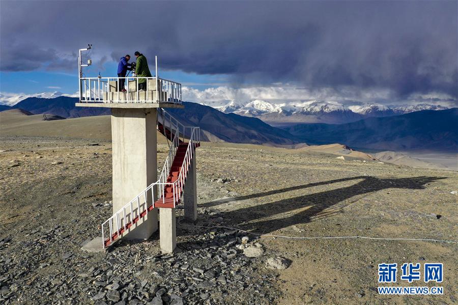 在中國科學(xué)院新疆天文臺慕士塔格觀測站,馮國杰和助理觀測員在戶外工作(6月15日攝,無人機照片)。新華社記者胡虎虎攝