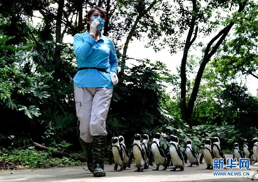 6月26日,上海動物園飼養(yǎng)員引導企鵝在園內(nèi)漫步。端午小長假第二天,上海動物園開展“企鵝漫步科普行”活動,受到游客歡迎。新華社記者 張建松 攝