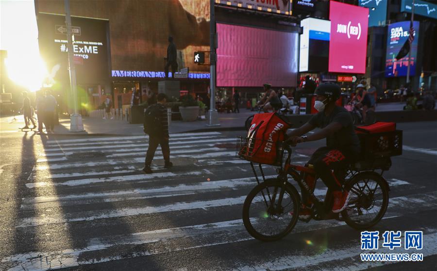 6月27日,一名送貨員騎車(chē)經(jīng)過(guò)美國(guó)紐約時(shí)報(bào)廣場(chǎng)。美國(guó)約翰斯·霍普金斯大學(xué)27日發(fā)布的新冠疫情最新統(tǒng)計(jì)數(shù)據(jù)顯示,截至美國(guó)東部時(shí)間27日16時(shí)35分(北京時(shí)間28日4時(shí)35分),美國(guó)累計(jì)新冠確診病例2500419例,累計(jì)死亡病例125434例。新華社記者王迎攝