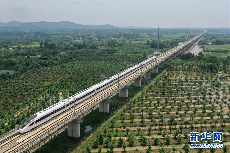 6月28日,列車在商合杭高鐵浙江安吉縣境內(nèi)行駛(無人機(jī)照片)。新華社記者黃宗治攝
