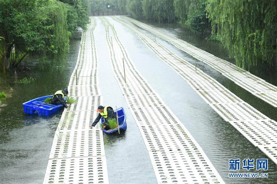 6月29日,工作人員在吳興區(qū)湖東街道的“水上稻田”插秧。今年以來(lái),浙江湖州吳興區(qū)湖東街道開(kāi)始在轄區(qū)河道大規(guī)模推廣“水上稻田”新型農(nóng)業(yè)項(xiàng)目,利用浮島進(jìn)行特種水稻種植,既能凈化水體,又能產(chǎn)出生態(tài)稻谷?!八系咎铩鳖A(yù)計(jì)在11月實(shí)現(xiàn)收割。新華社記者翁忻旸攝