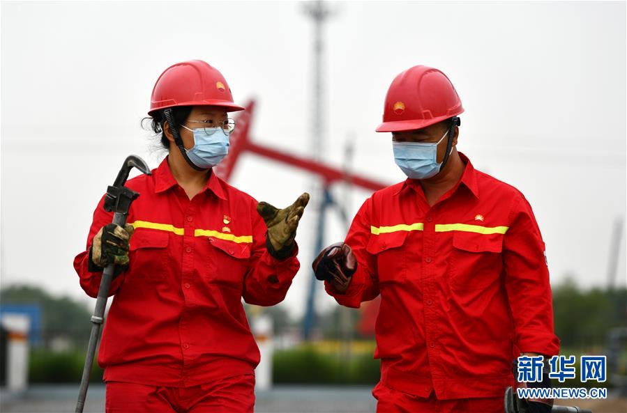 6月29日,馮萌萌(左)和同事在大港油田采油二廠二區(qū)內(nèi)巡查。