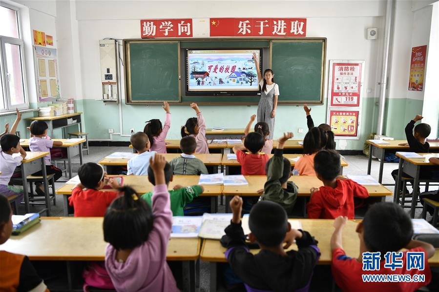 寧夏銀川市永寧縣閩寧鎮(zhèn)原隆村原隆小學(xué),老師在用電子屏給一年級的孩子們上課(2019年9月3日攝)。新華社記者王鵬攝